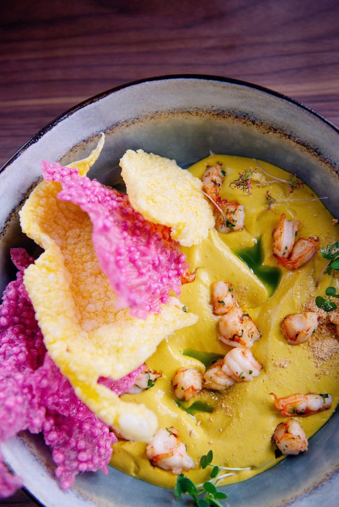 Dagens fiskefångst – Potatispuré – Saffransås – Rostade körsbärstomater – Handskalade räkor